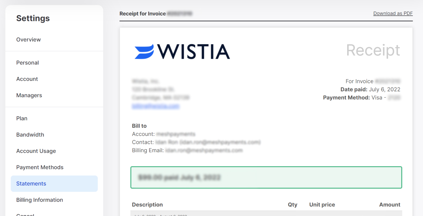 If you want to avoid the above steps, you can simply use Mesh Payments to pay for software tools. Enjoy hassle-free automatic collection and matching of Wistia receipts, and one-click reconciliation that syncs data directly with your ERP, saving you hours closing your books every month.